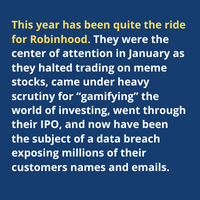 While we are talking about Robinhood, here is the latest hit to their reputation. This year has been quite the ride for Robinhood. They were the center of attention in January as they halted trading on meme stocks, came under heavy scrutiny for “gamifying” the world of investing, went through their IPO, and now have been the subject of a data breach exposing millions of their customers names and emails.