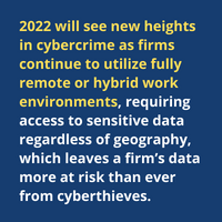 Yenamandra: 2022 will see new heights in cybercrime as firms continue to utilize fully remote or hybrid work environments, requiring access to sensitive data regardless of geography, which leaves a firm’s data more at risk than ever from cyberthieves. The top three cyber threats this year for wealth management are: