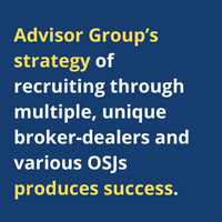 Why it matters: Advisor Group’s strategy of recruiting through multiple, unique broker-dealers and various OSJs produces success. Spurning the one-size-fits-all approach for the we’ve-got-something-for-you approach and recruiting individual advisors rather than just firms yields results and tallies large asset numbers for Advisor Group.