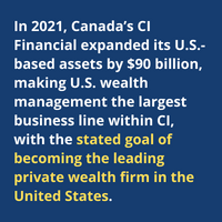 Why it matters: The staggering numbers speak for themselves and represent ongoing M&A activity, not just a one-and-done spike. In 2021, Canada’s CI Financial expanded its U.S.-based assets by $90 billion, making U.S. wealth management the largest business line within CI, with the stated goal of becoming the leading private wealth firm in the United States. Look for CI Financial to establish itself firmly within the American wealth management space.