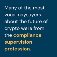 Perhaps of most relevance for this column, many of the most vocal naysayers about the future of crypto were from the compliance supervision profession.