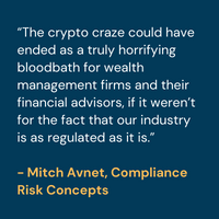 According to Mitch Avnet, Managing Partner of Compliance Risk Concepts, a national compliance consultancy for financial services firms, “The crypto craze could have ended as a truly horrifying bloodbath for wealth management firms and their financial advisors, if it weren’t for the fact that our industry is as regulated as it is. Seasoned compliance experts are much more likely to tread very carefully when dealing with new assets that seem to be operating in an unregulated, ‘wild west’ sort of way.”