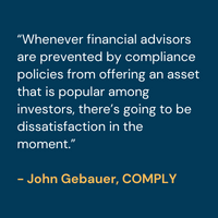 From the point of view of John Gebauer, President of COMPLY, a regtech compliance firm, “Whenever financial advisors are prevented by compliance policies from offering an asset that is popular among investors, there’s going to be dissatisfaction in the moment.”