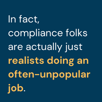 In fact, compliance folks are actually just realists doing an often-unpopular job: Making sure financial advisors don’t face a career-altering catastrophe, and firms don’t suffer an existential threat in the form of massive regulatory fines and penalties.