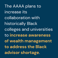 The AAAA also plans to increase its collaboration with historically Black colleges and universities including Howard University, Morehouse College and Spelman College, increase awareness of wealth management to address the Black advisor shortage, and strengthen its partnership with Merrill Lynch, J.P. Morgan, Edward Jones and Wells Fargo.