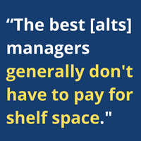 According to Brod, such arrangements typically take the form of a placement fee, a percentage of the management fee, or performance fees charged by the platform to the alts managers in exchange for shelf space.