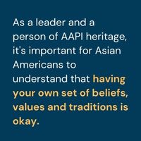 As a leader and a person of AAPI heritage, it's important for Asian Americans to understand that having your own set of beliefs, values and traditions is okay. It is part of who we are and how we lead.