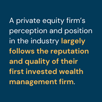 The private equity firm’s perception and position in the industry largely follows the reputation and quality of their first invested wealth management firm.