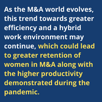 As the M&A world evolves, this trend towards greater efficiency and a hybrid work environment may continue, which could lead to greater retention of women in M&A along with the higher productivity demonstrated during the pandemic.