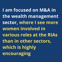 I am focused on M&A in the wealth management sector, where I see more women involved in various roles at the RIAs than in other sectors, which is highly encouraging.
