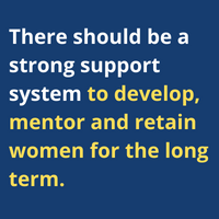 Companies should be proactive about recruiting qualified women to diversify the team. There should be a strong support system to develop, mentor and retain women for the long term. A woman mentor can have a meaningful impact on a female colleague’s career development. This is the responsibility of women to each other.
