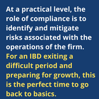 Let’s start with this: At a practical level, the role of compliance is to identify and mitigate risks associated with the operations of the firm. For an IBD exiting a difficult period and preparing for growth, this is the perfect time to go back to basics.