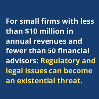 And for small firms with less than $10 million in annual revenues and fewer than 50 financial advisors? Regulatory and legal issues can become an existential threat.
