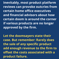 Inevitably, most product platform reviews can provoke outcries from certain home office executives and financial advisors about how certain doom is around the corner if various products are no longer approved by the firm.