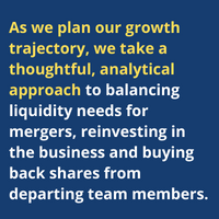 As we plan our growth trajectory, we take a thoughtful, analytical approach to balancing liquidity needs for mergers, reinvesting in the business and buying back shares from departing team members. In certain instances, depending the structure and timing of a merger, Coldstream will lean on long-time relationship with a Pacific Northwest regional bank to access additional credit.