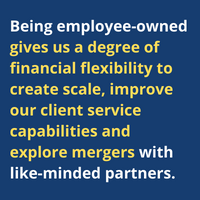 The first is to get clarity on who we serve. Being employee-owned incentivizes each person in our organization to create the best experiences for clients and their fellow team members/owners. Compared with close ownership among a small group of executives or outside ownership by a third party, this deeply affects how we relate and work together. It's like a family, one in which every employee is pulling for everyone else to be successful in their roles because when one person succeeds, we all succeed.