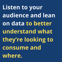 Additionally, listen to your audience and lean on data to better understand what they’re looking to consume and where. Performance metrics, such as engagement, audience growth and impressions, can show you how to reach and grow your targets.
