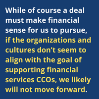 While of course a deal must make financial sense for us to pursue, if the organizations and cultures don’t seem to align with the goal of supporting financial services CCOs, we likely will not move forward.