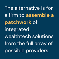 The alternative is for a firm to assemble a patchwork of integrated wealthtech solutions from the full array of possible providers. The benefit of the patchwork approach is the potential for better customization than the nearly all-in-one approach, but it can be costly and still take a lot of time to get right through trial-and-error and steep learning curves.
