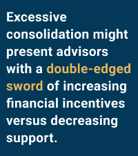 Choice is key to obtaining the best technology and practice development resources relevant to a specific advisor. In the long term, potentially excessive consolidation might present advisors with a double-edged sword of increasing financial incentives versus decreasing support. If that transpires, advisors may have to decide whether they should accept the situation at a firm they joined just a few years ago, leave for yet another firm in hopes that its offering remains robust, or even start their own firm.