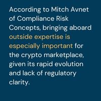 According to Mitch Avnet, Founder and Managing Partner of Compliance Risk Concepts (CRC), a national consultancy, bringing aboard outside expertise are especially important for the crypto marketplace, given its rapid evolution and lack of regulatory clarity.
