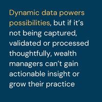 Without the right kind of integration, financial advisors struggle to put together a complete and updated picture of their client, and different teams are rarely on the same page – which impacts efficiency and ultimately, the customer experience. Dynamic data powers possibilities, but if it’s not being captured, validated or processed thoughtfully, wealth managers can’t gain actionable insight or grow their practice.