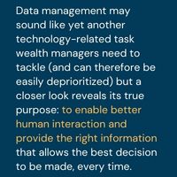 Data management may sound like yet another technology-related task wealth managers need to tackle (and can therefore be easily deprioritized) but a closer look reveals its true purpose: to enable better human interaction and provide the right information that allows the best decision to be made, every time.