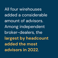 2. All four wirehouses – Merrill Lynch, UBS, Wells Fargo and Morgan Stanley – added a considerable amount of advisors. Among independent broker-dealers, the largest by headcount – including LPL Financial, Raymond James, Ameriprise, Cetera and Commonwealth – added the most advisors in 2022.