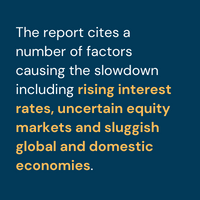 The report cites a number of factors causing the slowdown including rising interest rates, uncertain equity markets and sluggish global and domestic economies. The report states, “Buyers and sellers alike became more cautious about partnership decisions. Buyers were more selective with the opportunities they pursued. Meanwhile, some sellers paused due to valuation concerns.”