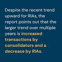 RIAs and the “other” category made up for the decline, with RIAs capturing 69 deals in 2022, for 26% of deals, and the “other” category (including private equity and insurance firms) entering 60 deals, at 23%. Despite the recent trend upward for RIAs, the report points out that the larger trend over multiple years is increased transactions by consolidators and a decrease by RIAs.