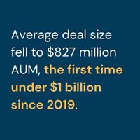 DeVoe’s report also notes that almost 75% of transactions were with sellers overseeing assets under management (AUM) of less than $1 billion, with firms overseeing AUM between $100 million and $500 million accounting for half of the transaction volume. Average deal size fell to $827 million AUM, the first time under $1 billion since 2019.