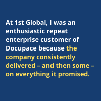 I was an enthusiastic repeat enterprise customer of Docupace because the company consistently delivered – and then some – on everything it promised. Partnering with Docupace at 1st Global, we achieved 97% advisor satisfaction with the back office. We also dramatically reduced new account opening times to a few hours, while driving our ability to scale our business without sacrificing quality or service.