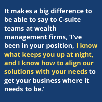 It makes a big difference to be able to say to C-suite teams at wealth management firms, “I’ve been in your position, I know what keeps you up at night, and I know how to align our solutions with your needs to get your business where it needs to be.”