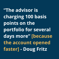 Fritz adds that digital account opening can boost revenue for advisors. “We can start accruing fees on that account several days early, right? So the advisor is charging 100 basis points on the portfolio for several days more,” because the account opened faster. “That’s 2% more than you would have otherwise made in that year. That’s real money.”