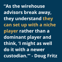 “As the wirehouse advisors break away, they understand they can set up with a niche player rather than a dominant player and think, ‘I might as well do it with a newer custodian,’” says Fritz, noting as an example a client who is currently leaving a wirehouse with the same thought process.