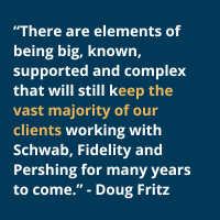 Fritz concludes that, “There are elements of being big, known, supported and complex that will still keep the vast majority of our clients working with Schwab, Fidelity and Pershing for many years to come. The average client that we work with is going to stay with them, and that makes sense.”