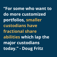 According to Fritz, “The new custodians are faster, cheaper and more lined-up for the future. Especially for some who want to do more customized portfolios, they have fractional share abilities which lap the major custodians today. They have better functionality, access to data and costs.”