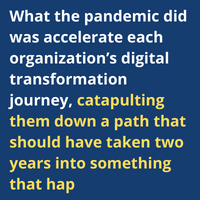 However, this move toward digital transformation was already happening prior to the pandemic due to demographic shifts and an increase in participation in the workplace from ‘digital native’ Gen Z individuals. What the pandemic did was accelerate each organization’s digital transformation journey, catapulting them down a path that should have taken two years into something that happened in two months.