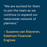 Suzanne van Staveren, Edelman’s EVP and Chief Financial Officer, said, “We are excited for them to join the team as we continue to expand our nationwide network of planners. Our innovative technology and marketing capabilities allow us to seamlessly integrate RIAs of any size and geographic footprint. This acquisition is another example of how we’re attracting exceptional firms that fit our strategy to offer a modern wealth planning experience for clients.”