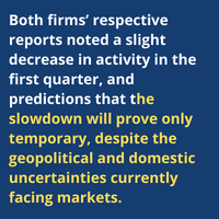 Both firms’ respective reports noted a slight decrease in activity in the first quarter, and predictions that the slowdown will prove only temporary, despite the geopolitical and domestic uncertainties currently facing markets.