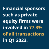 4. Financial sponsors such as private equity firms were involved – either directly or indirectly – in 77.3% of all transactions in Q1 2023, when PE firms made direct investments totaling approximately $505.8 billion, which is more than in full-year 2022, ECHELON found. This quarter featured direct investments in major firms such as Clayton, Dublier, & Rice taking Focus Financial private and Harvest Partners taking a minority stake in Mercer Advisors.
