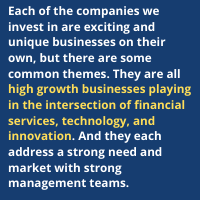 Each of the companies we invest in are exciting and unique businesses on their own, but there are some common themes. They are all high growth businesses playing in the intersection of financial services, technology, and innovation. And they each address a strong need and market with strong management teams.