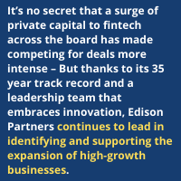 It’s no secret that a surge of private capital to fintech across the board has made competing for deals more intense – But thanks to its 35 year track record and a leadership team that embraces innovation, Edison Partners continues to lead in identifying and supporting the expansion of high-growth businesses.