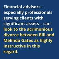 Financial advisors – especially professionals serving clients with significant assets – can look to the acrimonious divorce between Bill and Melinda Gates as highly instructive in this regard.