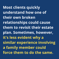 - Use impactful examples. Naturally, most clients quickly understand how one of their own broken relationships could cause them to revisit their estate plan. Sometimes, however, it's less evident why a similar experience involving a family member could force them to do the same. For instance, they could keep a child's divorce close to the vest, assuming that it would not require them to revisit their plan. To prevent this from happening, don't be shy about using examples that highlight the stakes, whether it's a former in-law getting using a chunk of a client's estate support a new spouse or an heir squandering an inheritance to bankroll a substance addiction.