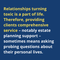 At the same time, relationships turning toxic is a part of life. Therefore, providing clients comprehensive service – notably estate planning support – sometimes means asking probing questions about their personal lives.