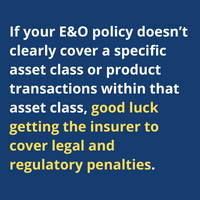 For wealth management firms and financial advisors placed in such a situation, just remember this: If your E&O policy doesn’t clearly cover a specific asset class or product transactions within that asset class, good luck getting the insurer to cover legal and regulatory penalties.
