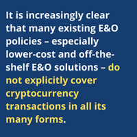 Well, as firms and financial advisors explore renewal of their error and omissions (E&O) insurance coverage for the following year, it is increasingly clear that many existing E&O policies – especially lower-cost and off-the-shelf E&O solutions – do not explicitly cover cryptocurrency transactions in all its many forms.
