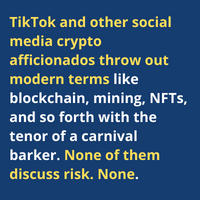 TikTok and other social media crypto afficionados throw out modern terms like blockchain, mining, NFTs, and so forth with the tenor of a carnival barker. None of them discuss risk. None.