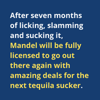After seven months of licking, slamming and sucking it, Mandel will be fully licensed to go out there again with amazing deals for the next tequila sucker.